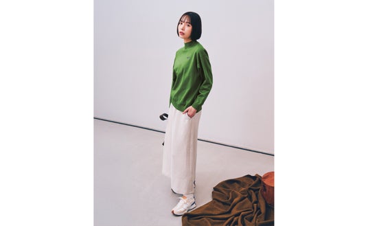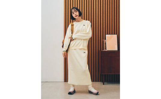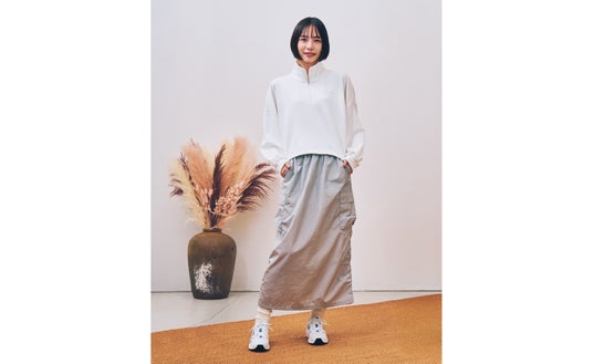 程よい肉感のダブルフェイス素材を使ったハーフジップのプルオーバー。ストレッチ性のあるやわらかな肌触りでとても着心地がよく、ゆったりとしたボリュームの袖とクロップド丈のシルエットは、カーゴスカートとの相性抜群。スカートは光沢感あるナイロン素材を使用し、異素材コーデが映えるスタイルです。
