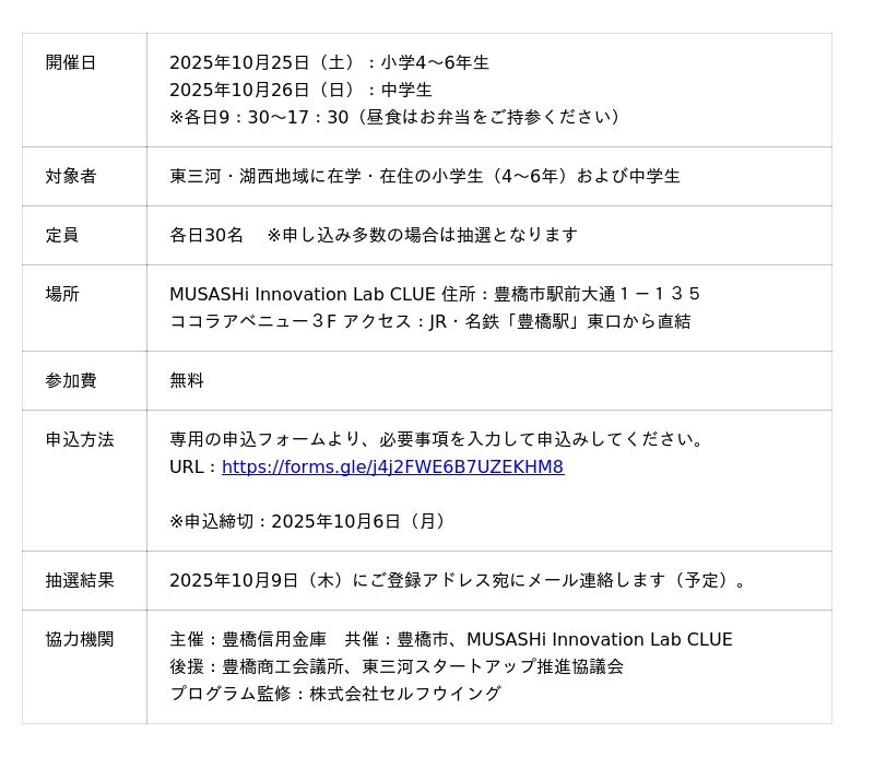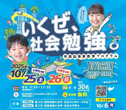 豊橋信用金庫(本社:愛知県豊橋市、理事長:山口 進)は、東三河・湖西地域の小学生(4~6年生)および中学生が、お金や経済、会社の仕組みについて学ぶことができる「早期起業家教育プログラム『TOYOSHIN STARTUP SCHOOL』」を、2025年10月25日(土)・26日(日)(各1日・8時間のプログラム)に開催します(参加費無料)。