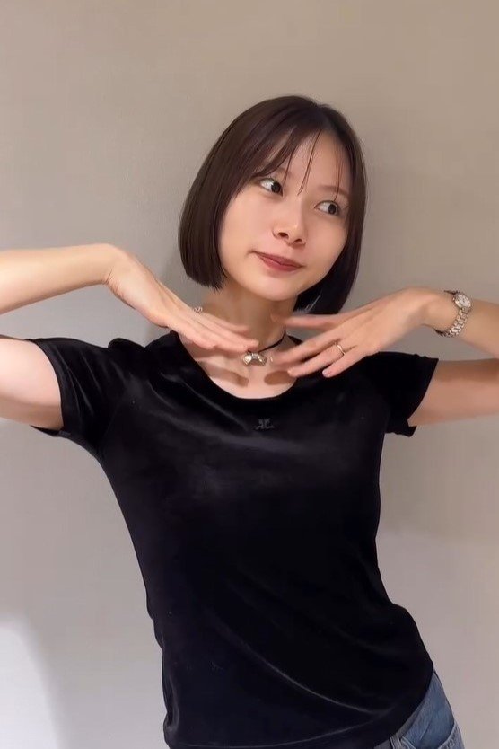 朝日さんは顎の下で両手をひらひらとさせ、満足げな表情で新しいヘアスタイルを見せています。