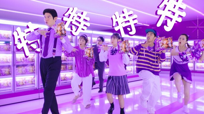冷凍食品売り場を背景に、紫色の衣装に身を包んだ鈴木さんらがパッケージを掲げリズミカルに行進。