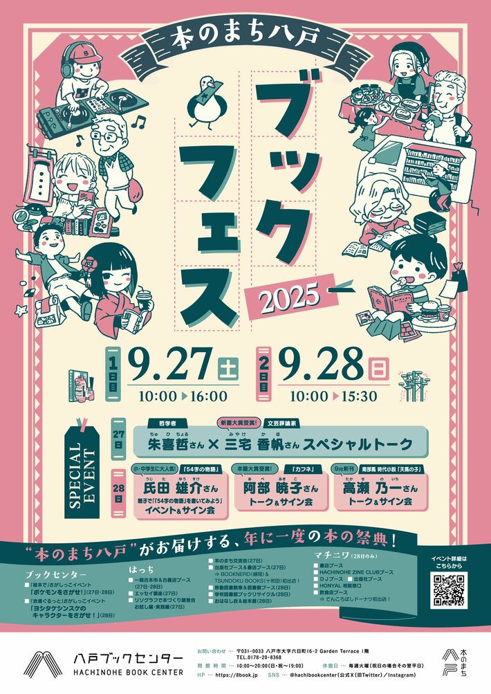 青森県八戸市の市営書店「八戸ブックセンター」が、年に一度の本の祭典「本のまち八戸ブックフェス2025」を9月27日(土)、28日(日)に開催します。市民参加型の一箱古本市や書店・出版社による物販ブースの出店のほか、哲学者・朱喜哲さんと文芸評論家・三宅香帆さんのスペシャルトークなど、見どころ満載です。
