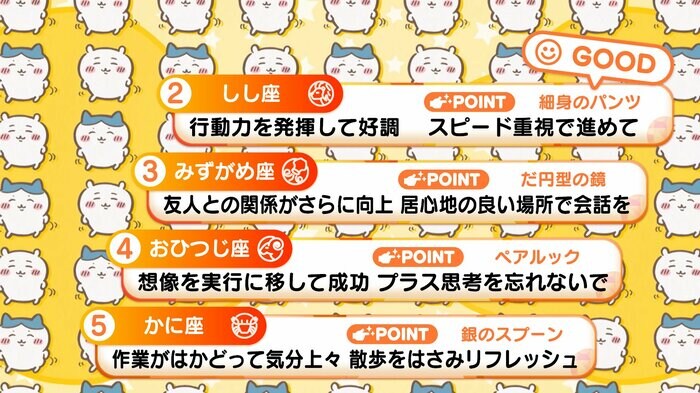 『めざましテレビ』で放送中の「ちいかわ占い」 テレビ放送がない日はお休みで、月~土:朝7時以降に更新予定です。