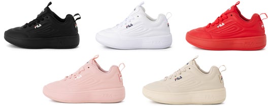 カラー: (上段左から)BLACK、WHITE、FILA RED、(下段左から)POWDER PINK、BEIGE
