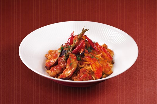 柔らかくみずみずしい旬の秋なすに、青唐辛子をきかせた辛口トマトソースを合わせました。
