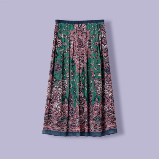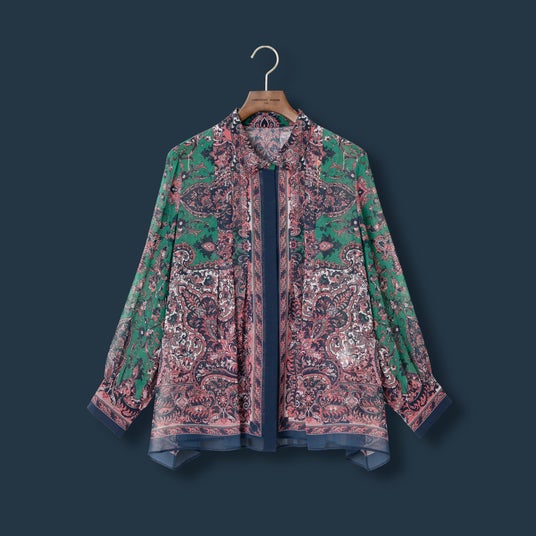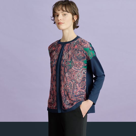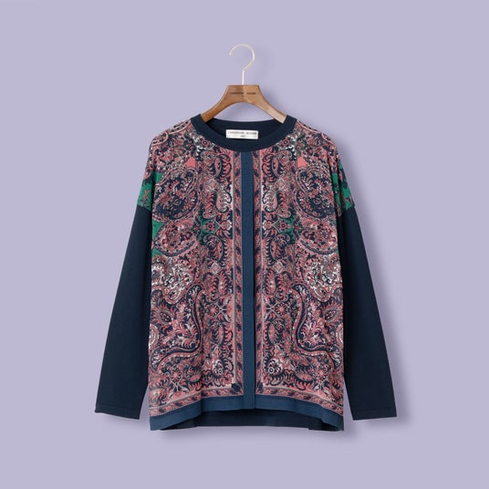 前身頃にペイズリープリントを配し、袖と後ろ身頃をニットで切り替えたデザイン。一枚で華やかさと上品さを兼ね備えます。