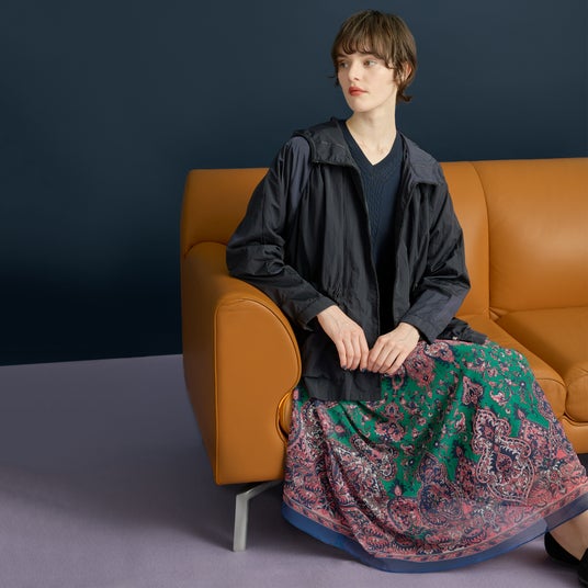 光沢感のあるフーデッドジャケットに浅めVネックのニットとプリントスカートを合わせ、抜け感と華やぎを両立させたスタイリング。