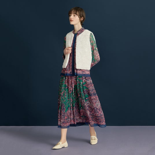 プリントブラウスとスカートのセットアップにシャギー素材のジレを合わせ、旬のムードを添えたスタイル。