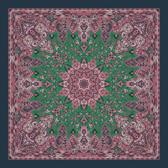 140cm四方の大判スカーフにペイズリー柄を大胆に配し、ネイビーのフレームで囲むことによって、上品さを一層際立たせています。