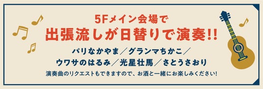 また、イベント期間中は5Fレストランフロアに、昭和レトロな情緒漂う“横丁”空間が登場します。加えてイベントを盛り上げるため、日替わりで“出張流し”による生演奏を実施。リクエストに応じて、演奏者がその場で楽曲を披露します。お酒とともに音楽を楽しむ、特別なひとときをお過ごしください。