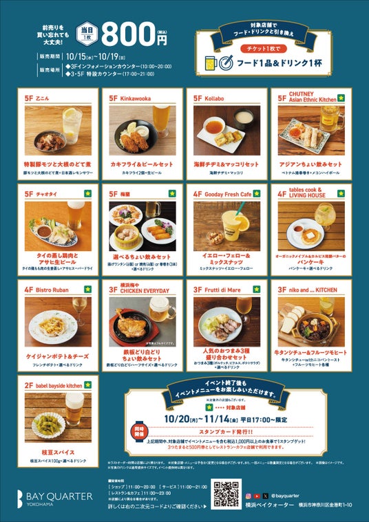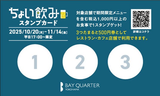 さらに、イベント終了後の10月20日(月)から11月14日(金)までの平日17:00以降は、対象店舗にてイベントメニューを提供します。イベントメニューを含む税込1,000円以上のお食事で、1スタンプを押印。スタンプを3つ集めると500円券としてレストラン・カフェ店舗でご利用いただけます。