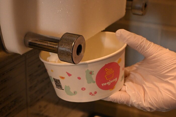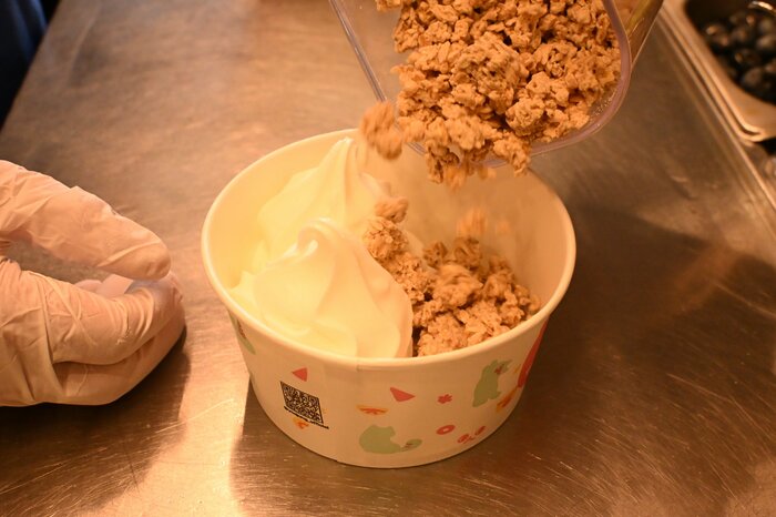 まずは、専用機械で作ったヨーグルトアイスをカップに盛ります。