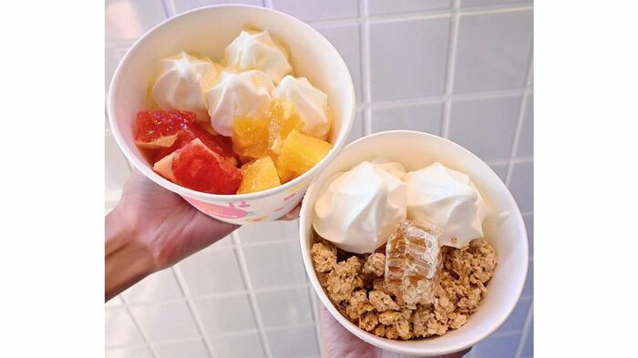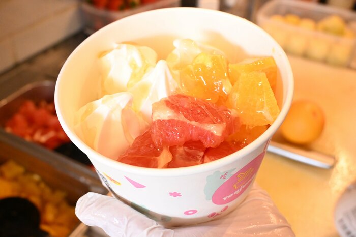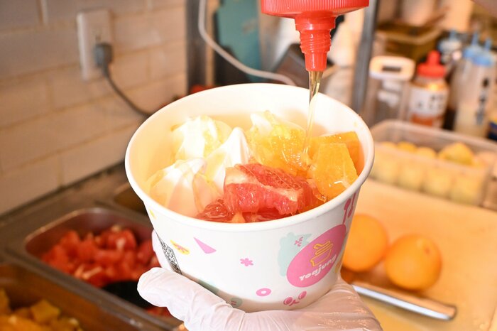 いろんなトッピングをのせて楽しむことができるヨアジョンですが、今回は9つのコンボメニューの中から、お店の人気トッピングが3つ入ったメニューを実際に作ってもらいました。