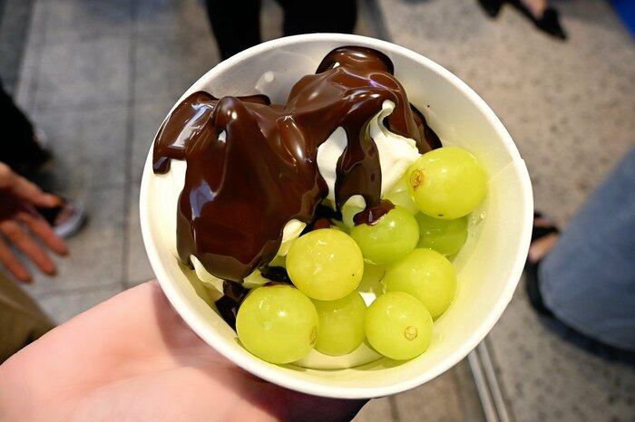 店長によると、韓国ではデリバリーが中心のため、形が崩れないようアイスクリームを低く盛ったり、マスカットは半分にカットしてのせたりと、日本とは異なる盛り付けで提供しているそうですが、新大久保店では高く盛られたアイスクリームにパリチョコがたっぷりとかかっていて、かなりボリューム感が感じられます。