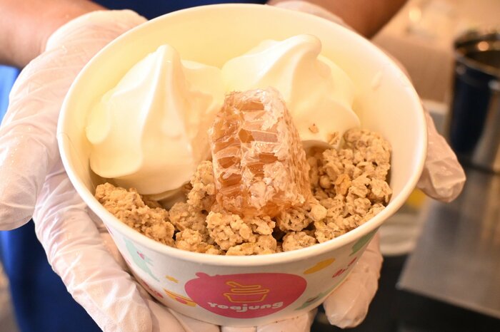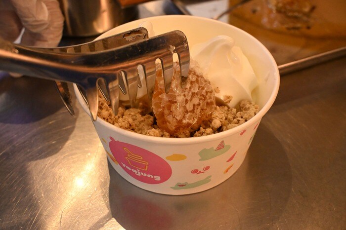そして、人気トッピングの「グラノーラ」と「ハニカムはちみつ」の2つを加えた「ヨアジョンシグニチャーコンボ」の完成です!