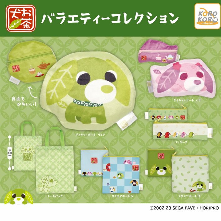 ラインナップは、縦幅300mmでA4サイズも収納できる「トートバッグ」をはじめ、ふわふわな手触りの「ダイカットポーチ」(2種)、小物の整理にぴったりな「スクエアポーチ」(2種)、行進するお茶犬たちのプリントが可愛い「ペンケース」の全6種。