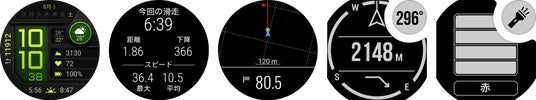 左から、AMOLEDモデルのウォッチフェイス、スキー、ナビゲーション、Dual Powerモデルの電子コンパス、フラッシュライト