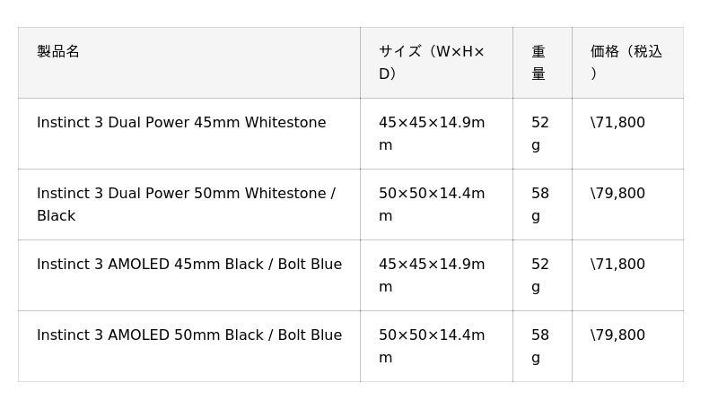 2025年1月に新発売した「Instinct 3」シリーズは、アウトドア愛好家に好評のソーラー充電機能による長時間バッテリーを備えた『Instinct 3 Dual Power(インスティンクト 3 デュアルパワー)』、より鮮やかで高い視認性を備えたAMOLEDディスプレイを搭載し、アウトドアシーンだけでなく、タウンファッションにも似合う、使いやすさを追求した『Instinct 3 AMOLED(インスティンクト 3 アモレッド)』、ミリタリー機能を搭載した『Instinct 3 Tactical』を展開しています。