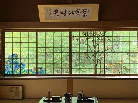 宮越家離れ・庭園「詩夢庵」 。ステンドグラス作家・小川三知の最高傑作と名高い3つの作品が美しい。