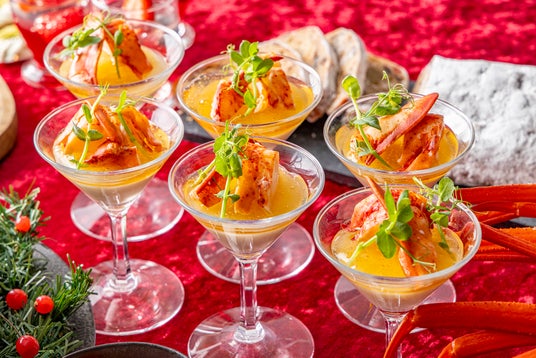 オマール海老、コンソメゼリー、カリフラワーのパンナコッタを合わせた、豊かで優しい風味に包まれる一品。気分華やぐカクテルグラスでご用意します。
