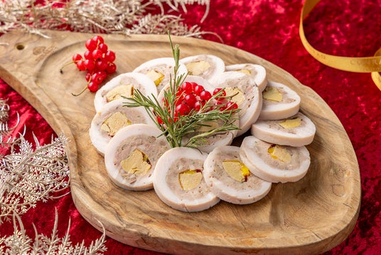 フランスの宮廷料理として発展した気品あふれる一品をフェスティブシーズンならではの食材でお届け。フォアグラとひき肉を七面鳥の胸肉で包み、肉の旨味が凝縮したしっとり柔らかな口あたりに。