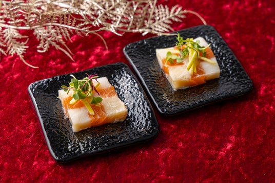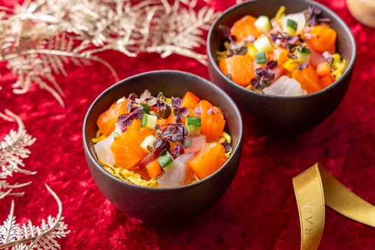 日本料理「風花」より、海の幸が詰まった海鮮丼をお届け。鮪、サーモン、鯛に、色鮮やかな野菜や花穂じそを添えて、フェスティブシーズンを彩る見た目にも美しいプレゼンテーションに。