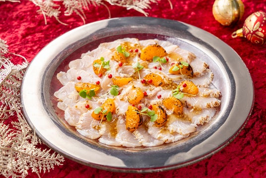 国産ブリをみかんと合わせた、冬の味覚を味わう一品。表面を炙った香ばしく脂ののったブリの旨味と、みかんの酸味が心地の良いコントラストを生み出します。