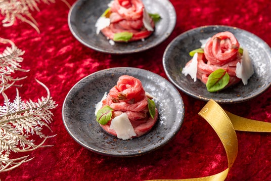 クリスマスの定番料理ローストビーフを良質な国産牛でご用意。低温調理でしっとり仕上げ、塩味の効いたペコリーノロマーノと、トリュフをベースにしたソースで華やかさをプラスしました。
