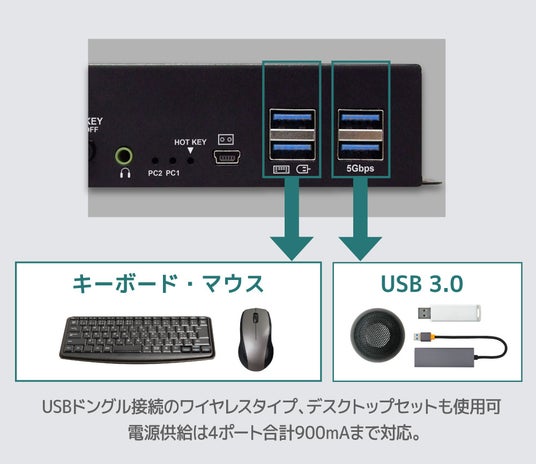 ※電源供給は4ポート合計900mAに対応。電源供給量は接続するPCに依存します。
