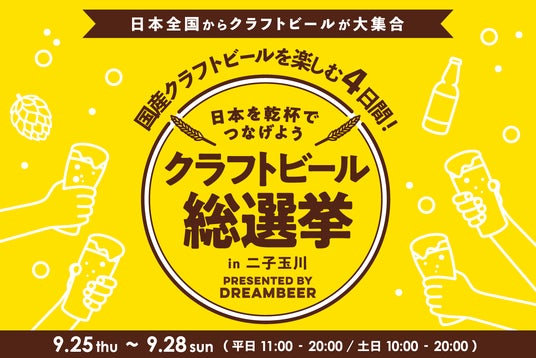 株式会社DREAMBEER(本社:東京都渋谷区 代表取締役:萩尾 陽平)は、2025年9月25日(木)~28日(日)の4日間、二子玉川ライズ中央広場 スタジオ & ホール(東京都世田谷区玉川)にて、ビールイベント「クラフトビール総選挙2025 in二子玉川」を開催いたします。