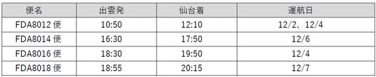 株式会社フジドリームエアラインズ(略称:FDA、本社:静岡県静岡市、代表取締役社長:本田 俊介)と、仙台国際空港株式会社(本社:宮城県名取市、代表取締役社長:前田 基)および21世紀出雲空港整備利用促進協議会(事務局:島根県出雲市、会長:飯塚 俊之)は、昨年度に引き続き2025年冬ダイヤの一部期間中、3者連携で『仙台=出雲』間をチャーター便として運航します。