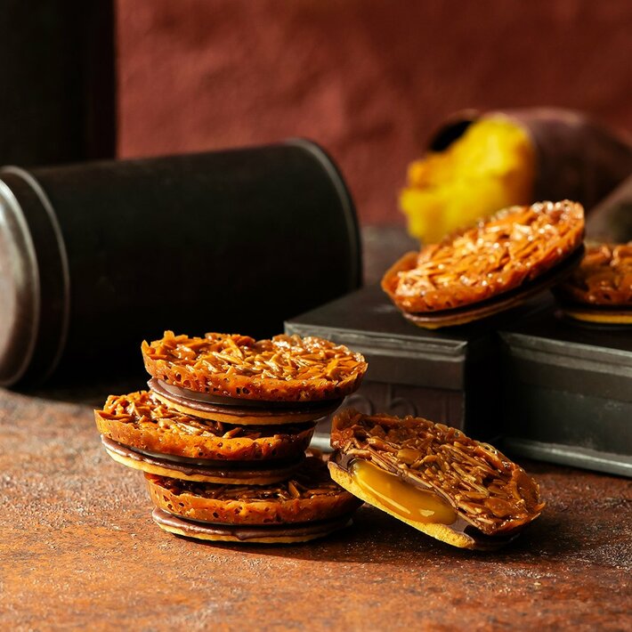 華やかな甘みのアーモンドフロランタンとバターサブレでミルクチョコレートと、さつま芋、バター、生クリームを合わせて炊き上げたスイートポテトキャラメルをサンドしました。