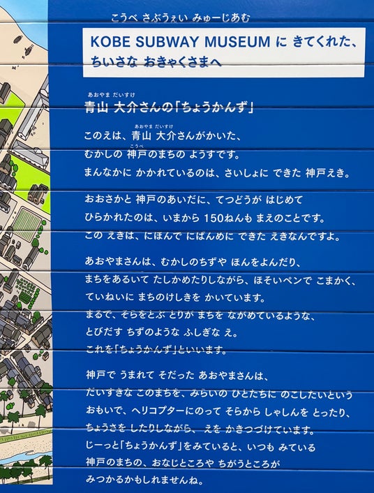 「KOBE SUBWAY MUSEUM」では、あらゆる年代の方にアートに興味を持ち、楽しんでいただけることを目指し、一般向けの作品キャプションに加えて、子ども向けのキャプションも各駅に設置しています。作品をご覧いただく際には、作品と一緒に説明のキャプションパネルも、お読みいただければ幸いです。