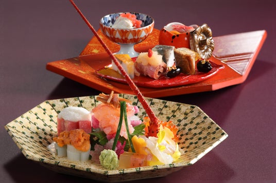 先附(胡桃豆腐) / 旬彩(柿なます、紅葉和えなど) / 吸物(菊花帆立貝柱) / 造り(伊勢海老吟醸酒洗いなど) / 焚合せ(海老芋含め煮) / 焼物(鰤味噌幽庵焼きなど) / 蒸し物(すっぽん小茶碗蒸し) / 揚げ物(蟹磯部揚げなど) / 留椀(伊勢海老袱紗味噌仕立て) / 土鍋炊きご飯 / 香の物 / 果実と和菓子
