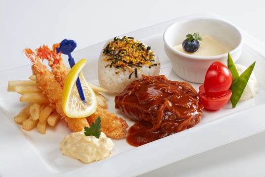ミニクリームコーンスープ / ハンバーグ / 海老フライ / フライドポテト / サラダ / おにぎり / デザート