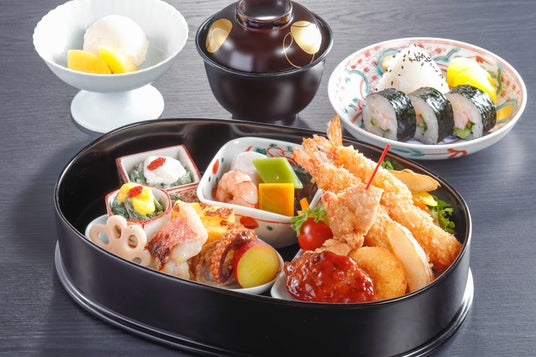 海老フライ / ハンバーグ / 鶏肉の唐揚げ / 出汁巻き / 野菜焚き合せ / 吸い物 / 巻き寿司 / アイスクリーム など