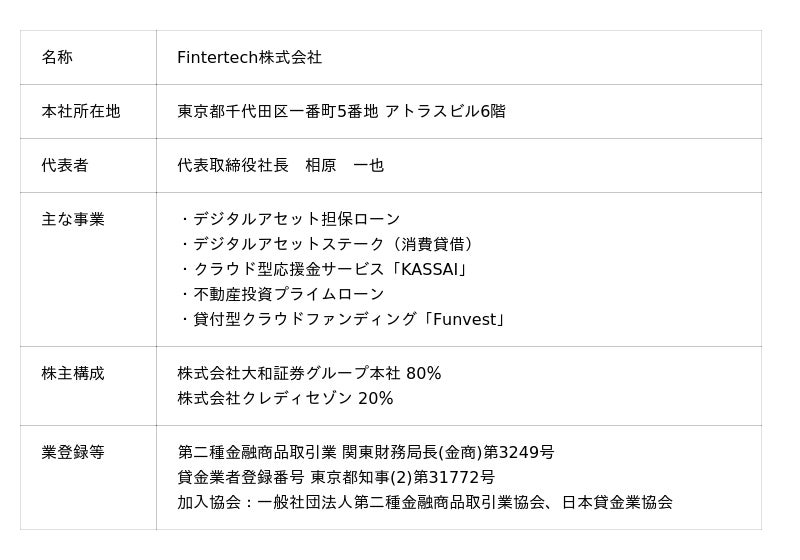 Fintertechは、大和証券グループ及びクレディセゾンがそれぞれ創業来培ってきた金融ビジネスのノウハウを礎としながら、最先端のテクノロジーの活用や外部企業との連携により次世代金融サービスを機動的にかつ柔軟に創出することを目指しています。 主な事業として、暗号資産を活用した「デジタルアセット担保ローン」及び「デジタルアセットステーク(消費貸借)」、クラウド型応援金サービスの「KASSAI」、「未来をわかちあう投資」を提供する貸付型クラウドファンディングサービス「Funvest(ファンベスト)」を展開しています。