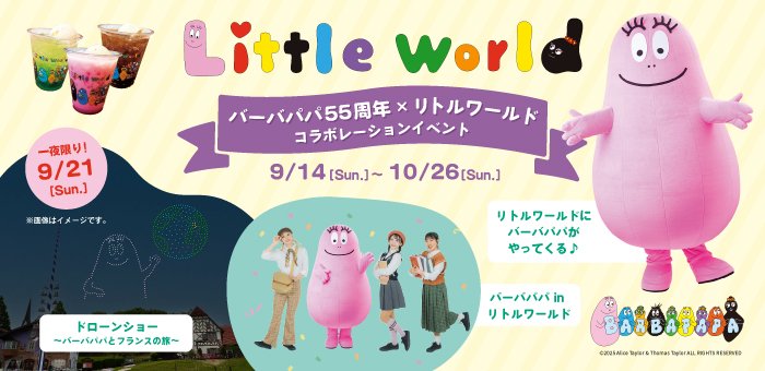 野外民族博物館リトルワールド(犬山市今井成沢90‐48 所長:猪飼 康平)では、2025年9月6日(土)~10月26日(日)の期間にて、フランス生まれのキャラクター「バーバパパ」とのコラボレーションイベントを開催中です。9月21日(日)には、世界初のバーバパパとのコラボレーションドローンショーも開催します。そのほか、バーバパパショーの開催やフォトスポットを設置します。