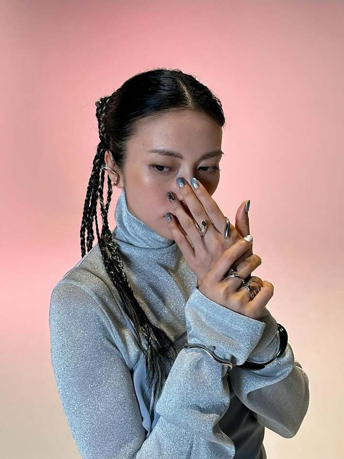 そして、シルバー系のネイルが光る指先で、口元を隠したポーズも公開。