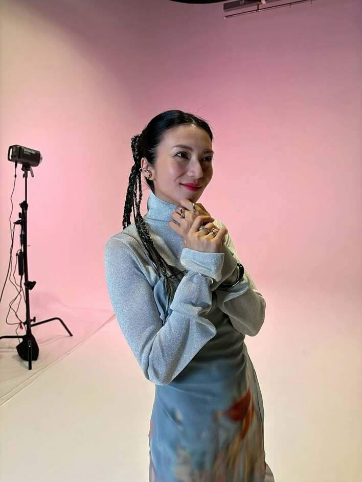 ニコニコ笑顔で、ラメがキラキラ輝くグレーのハイネックトップスに、キャミワンピースを重ねた柴咲さん。