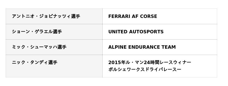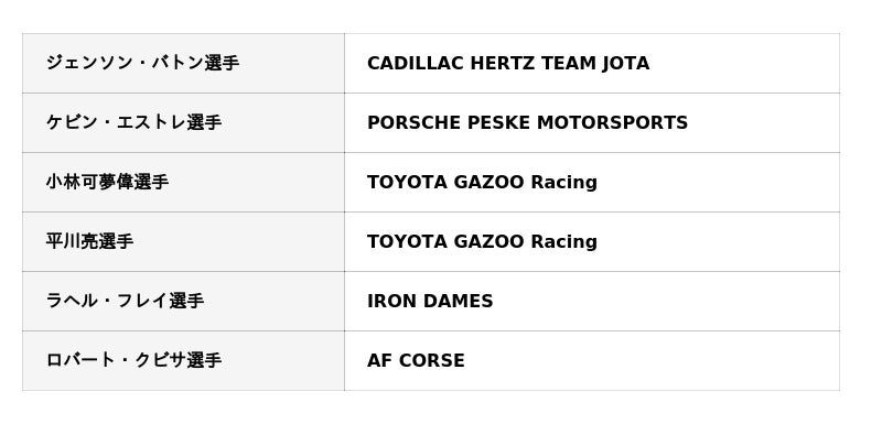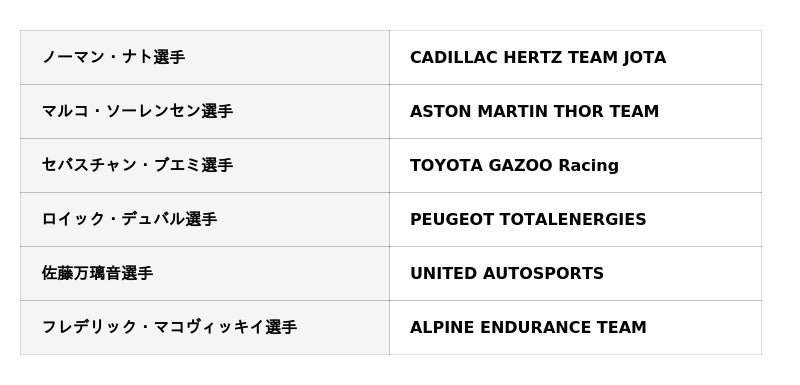 WEC富士ラストランのジェンソン・バトン選手、TOYOTA GAZOO Racing小林可夢偉選手、平川亮選手、前戦WEC第6戦でLMGT3クラス初優勝の佐藤万璃音選手に加え、日本のトップカテゴリーでも活躍したロイック・デュバル選手、今年のル・マン24時間レースで優勝したロバート・クビサ選手も出演決定! ※9/18現在