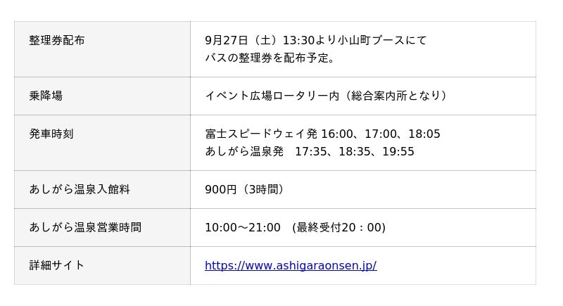 地元小山町にあるあしがら温泉まで、無料シャトルバスを運行します。