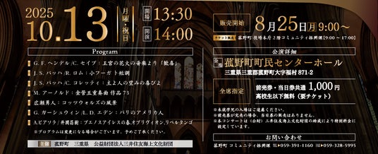 菰野町では、2025年10月13日(月・祝)菰野町町民センター ホールにおいて、NHK交響楽団の金管楽器奏者によるアンサンブルコンサート「ザ・チェンバーブラス ~NHK交響楽団金管奏者たち~」を開催します。