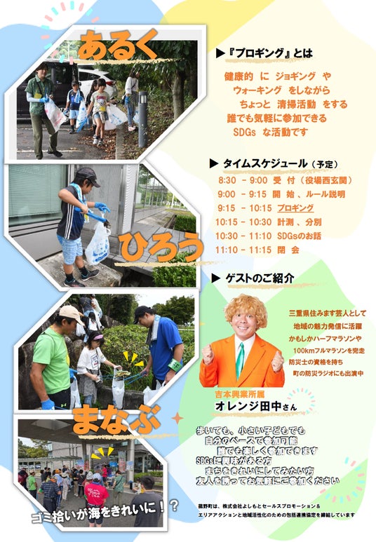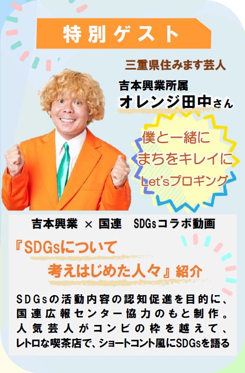 特別ゲストとして吉本興業所属の三重県住みます芸人、オレンジ田中さんをお迎えし、地域住民の方々とともに楽しく活動を進めます。