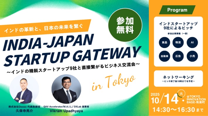 “行動で世の中を変えていく“を理念に掲げる株式会社Dooox(東京都品川区、代表取締役 久保寺亮介/以下「当社」)はインドのアクセラレーター兼投資家であるGHV(GreenHouseVentures)と共催にて、インドのスタートアップと日本企業による交流イベントを開催します。