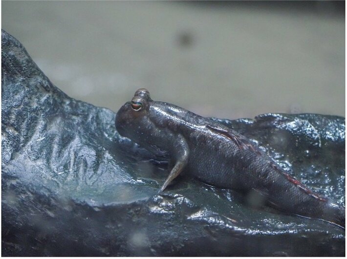 「トビハゼ」は高い皮膚呼吸能力を備えているため、空気中で活動することが可能です。干潟に生息し、胸ビレや尾ビレを使って泥の上を移動します。ぴょんぴょん飛び跳ねるウサギのような「トビハゼ」の姿をご覧いただけます。