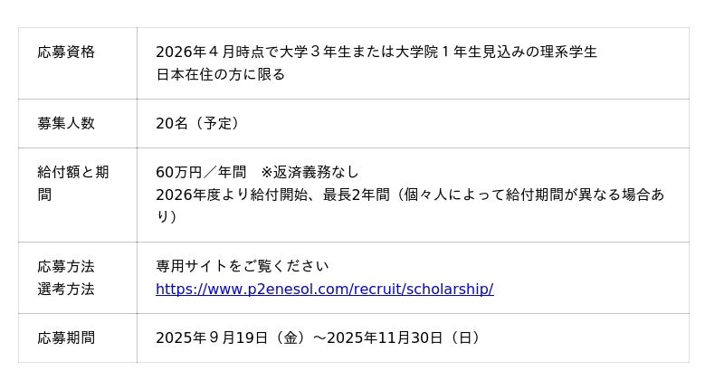 プライムプラネットエナジー&ソリューションズ株式会社(本社:東京都中央区、代表取締役社長:好田博昭、以下「当社」)は、理系学生を対象とした『グリーンバッテリー奨学金』制度について、2025年度も継続して募集を行うことを決定しました。