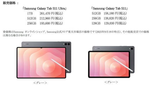 サムスン電子ジャパン株式会社は、これまでで最もインテリジェントかつ先進的なタブレット体験を実現するAIタブレット「Samsung Galaxy Tab S11 Ultra」、「Samsung Galaxy Tab S11」および専用の純正アクセサリーを、本日2025年9月19日(金)より、Samsungオンラインショップ(https://www.samsung.com/jp/offer)、Amazon(アマゾンジャパン合同会社)、家電量販店(ヨドバシカメラ・ビックカメラ・ヤマダデンキ・ジョーシン、その他量販店のECサイトおよび一部店舗)、Samsung公式ストア楽天市場店、「Galaxy Harajuku」(東京・原宿)、「Galaxy Studio Osaka」(大阪・なんば)にて、販売を開始いたします。