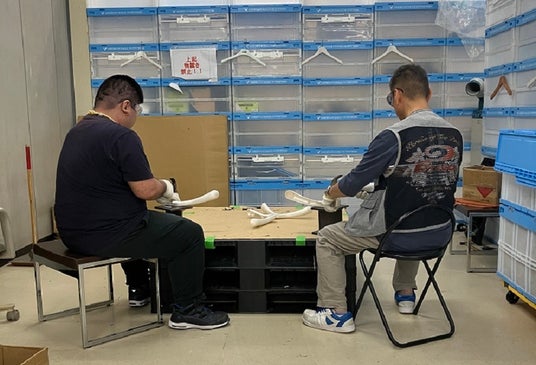 そのような中、昨年度取り組んだ店舗で使用する商品陳列用の水平リサイクルハンガー作製に続き、この度、販売用の水平リサイクルハンガーを企画しました。プラスチックのリサイクルは耐久性や色ムラ、コストの安定化を図る上でリサイクル材(再生材)とバージン材(新品の原料)を混合する事が多いのが特徴です。今回は原料を自社の破損および不要ハンガーに限定しプラスチックリサイクル率100%のハンガー作製を実現しています。また、障害のある方が活躍し自社内で粉砕作業を行うことでコスト面の課題も解決しています。