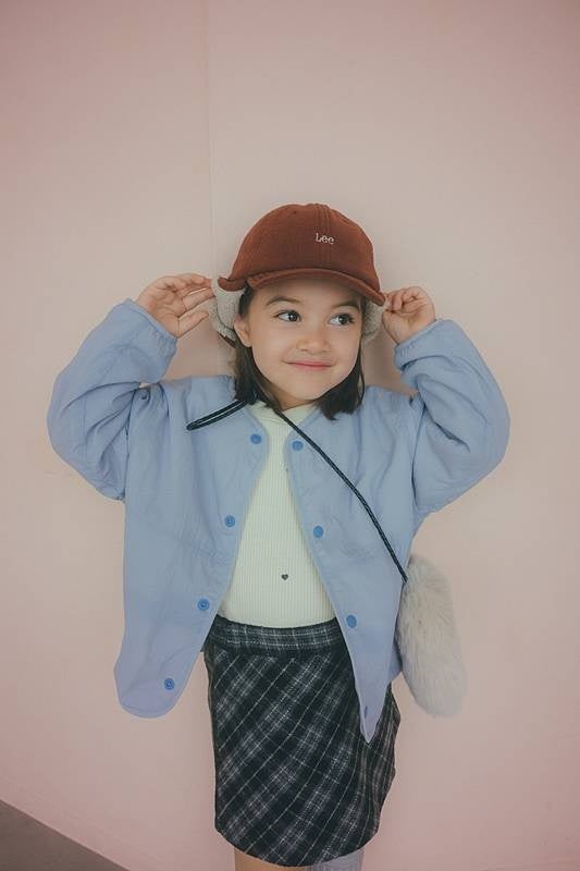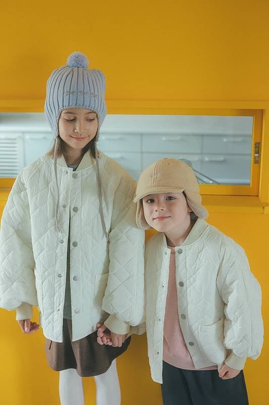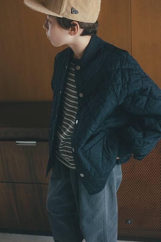 目を引く、幾何学ダイヤ柄、こどもが脱ぎ着しやすいラグランデザインのスタジャン風ブルゾンはユニセックスで着用可能。中に着こんでも着ぶくれしないシルエットもポイントです。
