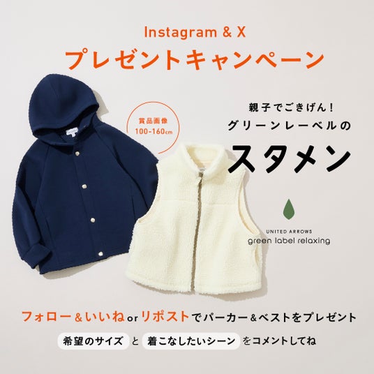 2025年9月19日(金)より、「ユナイテッドアローズ グリーンレーベル リラクシング」公式X・Instagramにおいて、「親子でごきげん!グリーンレーベルのスタメンプレゼントキャンペーン」を実施します。賞品として、合計6名の方に「スタメン」の「テントラインパーカー&ボアベスト」をプレゼントします。